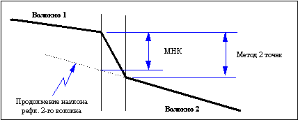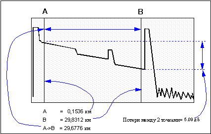 Оптический рефлектометр производит тысячи измерений по всей длине волокна. Точки с результатами измерений находятся друг от друга на расстоянии от 0‚5м до 16м. Эти точки выводятся на экран и образуют наклонную линию‚ идущую слева направо и сверху вниз. При этом по горизонтальной оси графика откладывается расстояние‚ а по вертикальной – уровень сигнала. Выбрав с помощью подвижных курсоров две любые точки с результатами измерений‚ можно определить расстояние между ними и разницу между уровнями сигнала в этих точках.